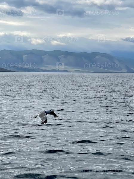 Чайка летит в небе над Байкалом. Красивый горный пейзаж в пасмурный день