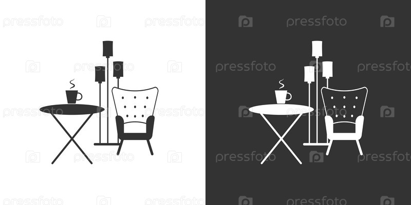 Интерьер с креслом, журнальным столиком и торшером. Черная и белая плоская иконка