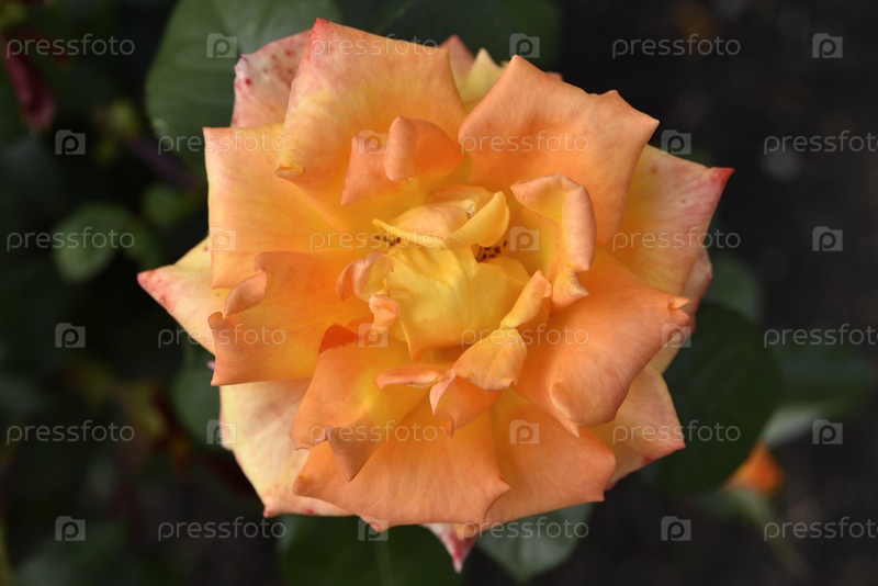 Большой оранжевый сочный цветок розы в летнем саду. Желтые розы