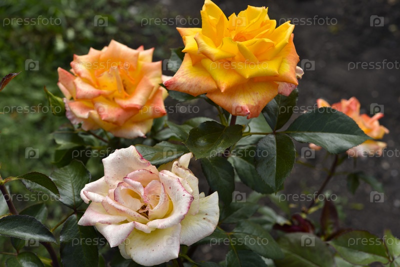 Куст с красивыми и сочными желтыми розами в летнем саду. Большие оранжевые цветы