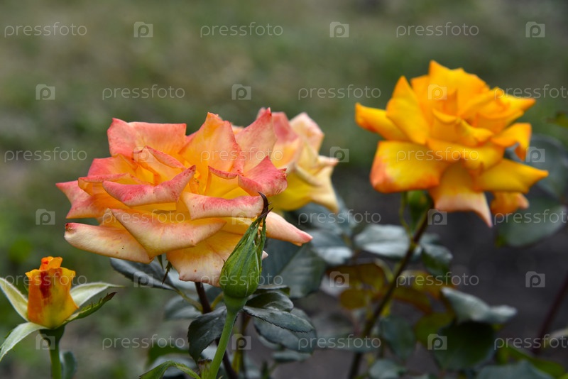 Куст с красивыми и сочными желтыми розами в летнем саду. Большие оранжевые цветы