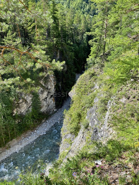 Горная река, протекающая в долине между лесом и высокой скалой, Бурятия, Россия