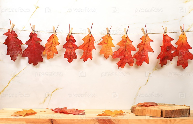 Пустой деревянный стол для демонстрации продукта с кленовыми листьями на светлом мраморном фоне, минимальная осенняя концепция, творческая осенняя композиция с экранным баннером. С Днем Благодарения и поздравительной открыткой, выборочный фокус