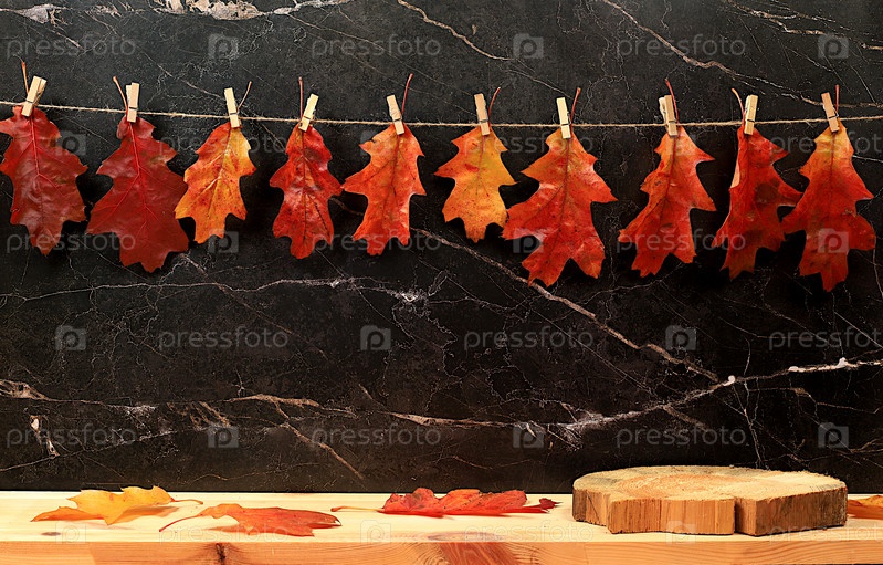 Пустой деревянный стол для демонстрации продукта с кленовыми листьями на бетонном фоне кухни, минимальная осенняя концепция, творческая осенняя композиция с экранным баннером. С Днем Благодарения и поздравительной открыткой,
