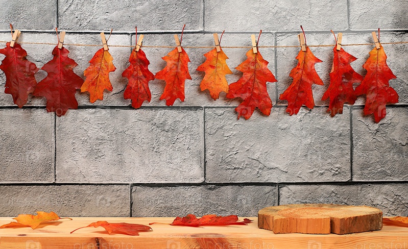 Пустой деревянный стол для демонстрации продукта с кленовыми листьями на бетонном фоне кухни, минимальная осенняя концепция, творческая осенняя композиция с экранным баннером. С Днем Благодарения и поздравительной открыткой