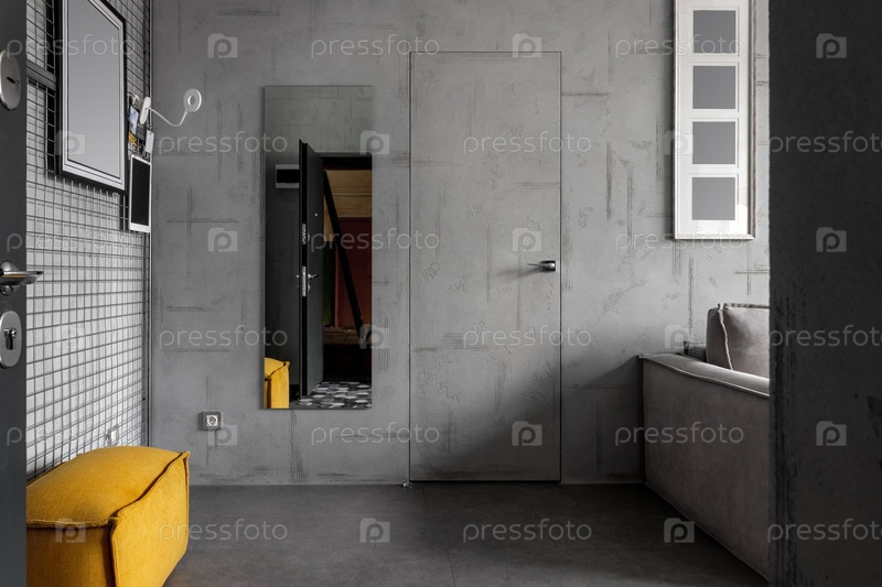 Современная прихожая с бетонными стенами и желтым пуфом