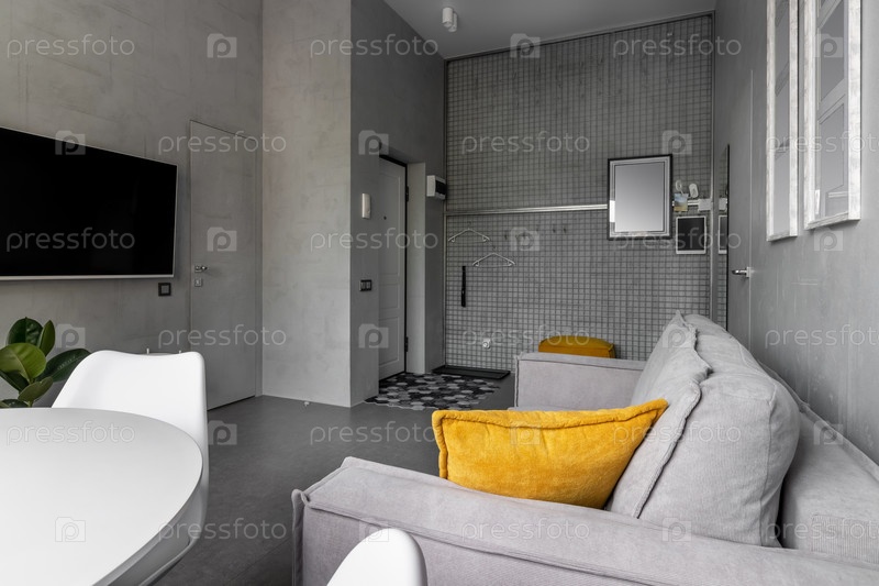 Современная гостиная с декоративной бетонной стеной, телевизором, шкафом, столом и стульями