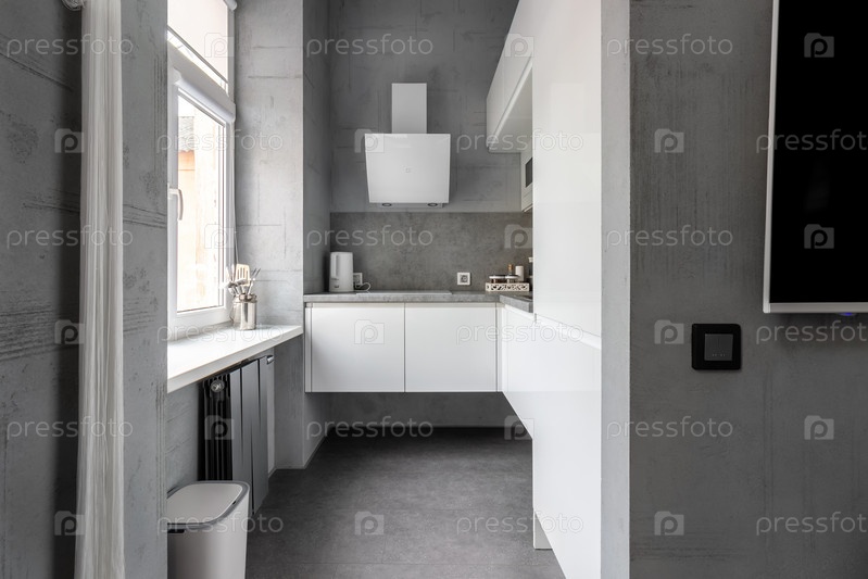 Светлый интерьер кухни в современной квартире в аренду, продажу и ведение блога. Чайник и посуда на белой мебели