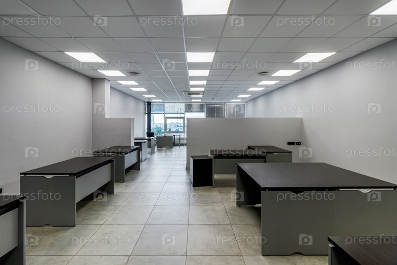 Интерьер современного офиса с огромными панорамными окнами, после ремонта