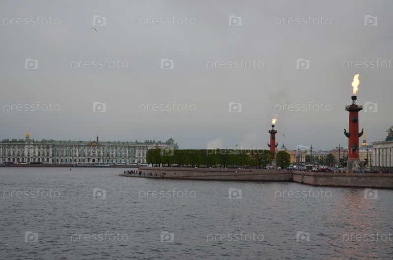 Вид на стрелку Васлильевского острова, Зимний дворец (Эрмитаж), Ростральные колонны с заженными факелами, здание Биржи