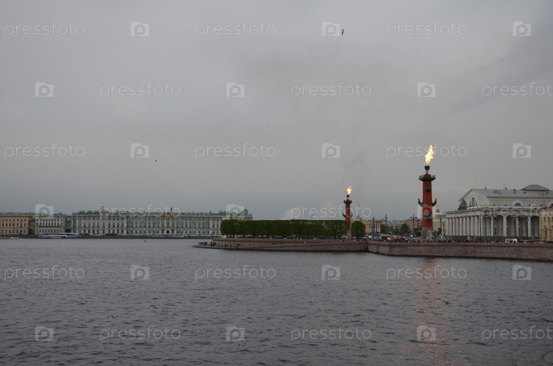 Вид на стрелку Васлильевского острова, Зимний дворец (Эрмитаж), Ростральные колонны с заженными факелами, здание Биржи