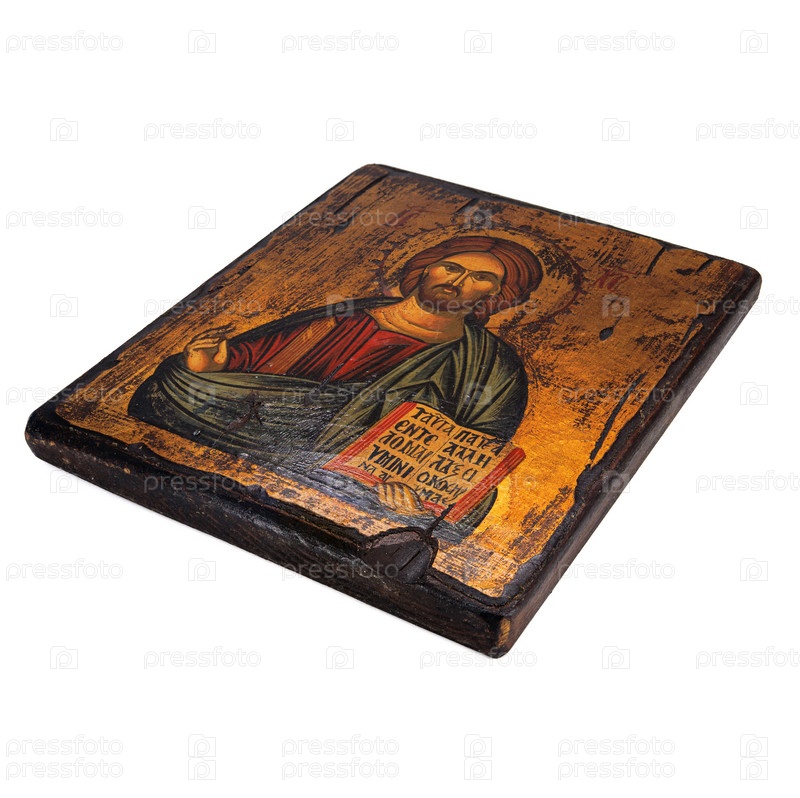 Современная рукописная икона на старинном дереве (дерево конца 19 века) на сусальном золоте Иисус Христос (копия византийской иконы 15 века)