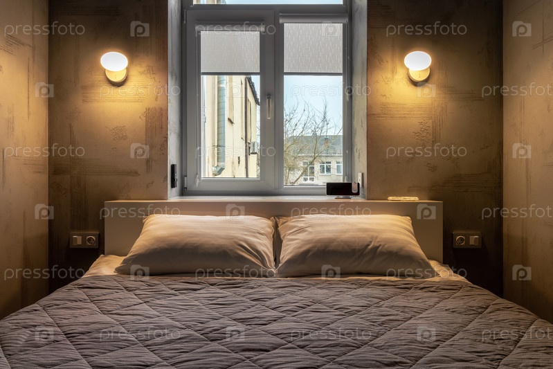 Кровать в спальне, на фоне окна и светящихся бра на стене