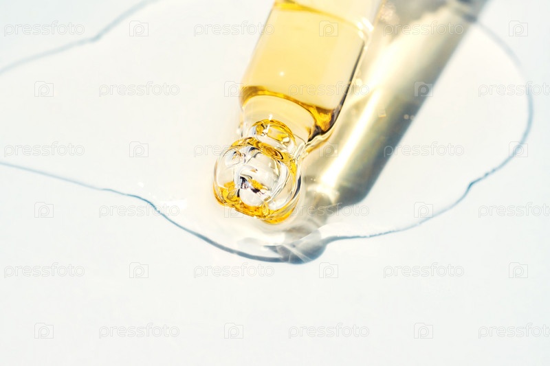 Брендинговый макет стеклянной бутылки-капельницы. Косметическая пипетка. Модный розовый фон. Концепция органической и косметической косметики. Резкий солнечный свет. Вид сверху
