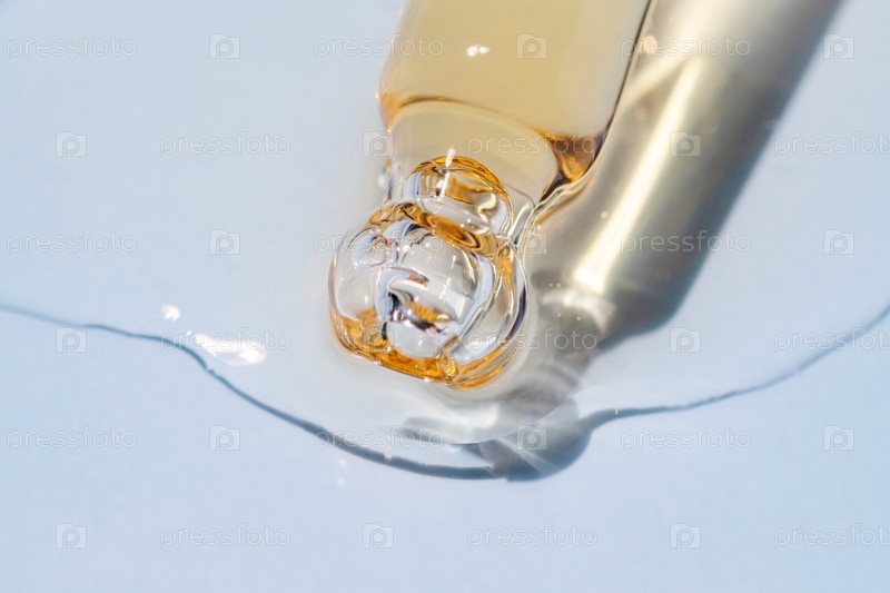 Пипетка для бутылок крупным планом и жидкий желто-оранжевый ретинол или гель или сыворотка витамина С на синем фоне