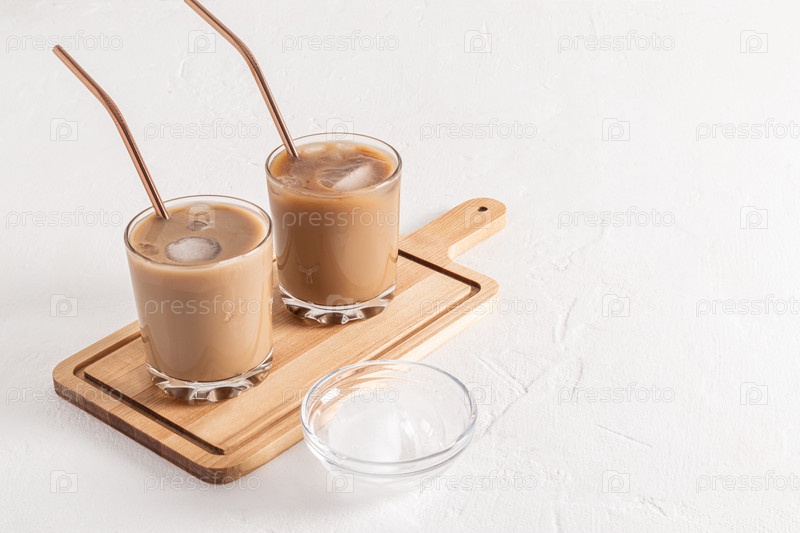 Два стакана вкусного прохладного долгого кофе с кубиками льда и эко-соломкой стоят на деревянной разделочной доске. Белый текстурированный фон. Место для копирования