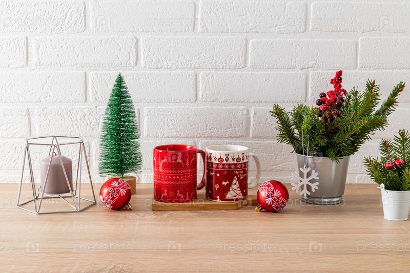 Фрагмент белой деревянной столешницы с различной кухонной утварью и рождественскими украшениями. свечи, шары, ветки ели