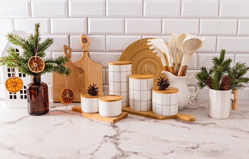 Красивый новогодний кухонный фон с набором кухонной утвари и баночками для хранения продуктов, украшенный рождественскими ветвями с натуральным декором