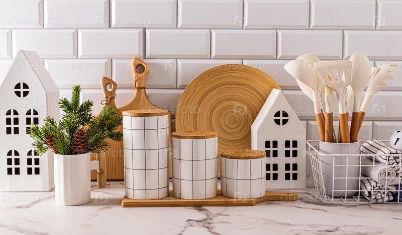 Набор стильных керамических банок для хранения сыпучих продуктов на кухне в праздничном рождественском интерьере на столешнице на фоне стены из белого кирпича