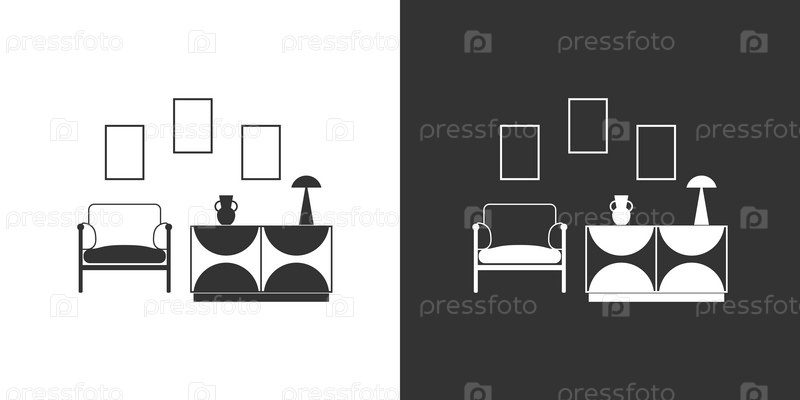 Интерьер гостиной с креслом и тумбочкой. Черная и белая плоская иконка
