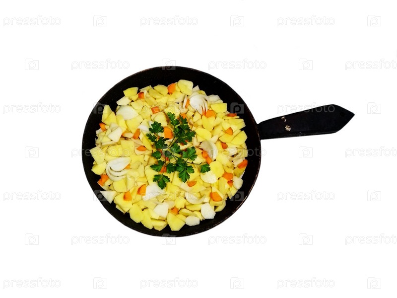 Сырой нарезанный картофель с луком, морковью и петрушкой для заваривания на старой железной сковороде