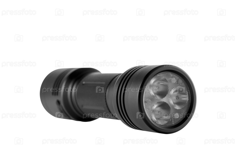Современный ручной фонарик черного светодиода, выделенный на белом фоне, алюминиевый корпус, двусторонний фонарик, студийная фотография