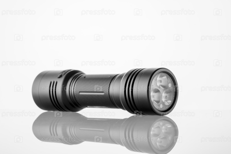 Черный светодиодный современный ручной фонарик на белом фоне с отражением, металлический прочный корпус, двусторонний, светодиодный фонарик, рефлексная ручка, студийное фото