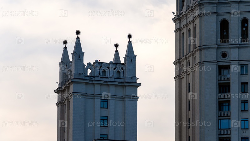 Москва, 01 июля 2023 г., Высотное здание на Котельнической набережной крупным планом декоративные элементы фасада