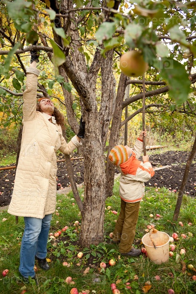Мать с сыном собирают яблоки