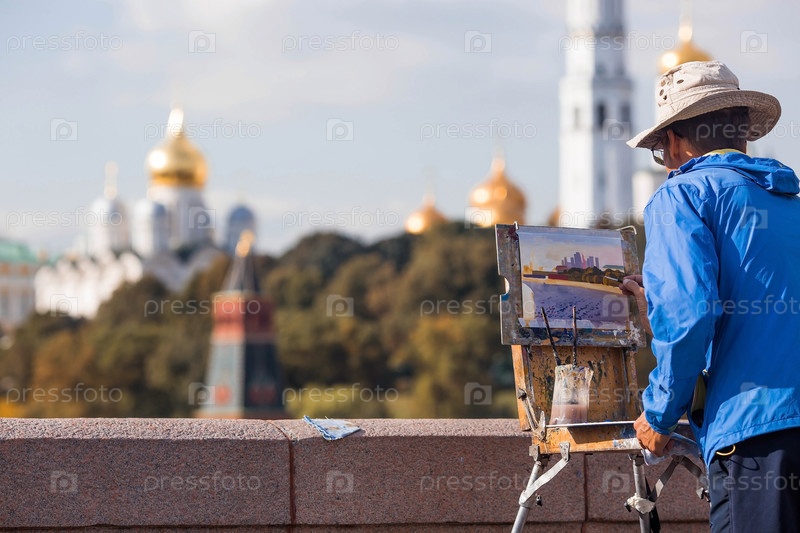 МОСКВА, РОССИЯ - 26 СЕНТЯБРЯ 2023 г.: Художник-мужчина рисует картину в центре Москвы. На картине изображена Москва-Сити солнечным осенним вечером. Творчество и отдых. Популярная туристическая достопримечательность