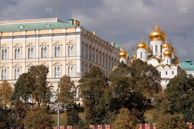 МОСКВА, РОССИЯ - 26 СЕНТЯБРЯ 2023 г.: Вид на Москву в осенний день. Кремлевские башни. Большой Кремлевский дворец, колокольня Ивана Великого и Успенский собор. Популярная туристическая достопримечательность