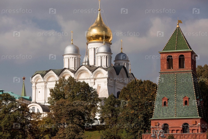 МОСКВА, РОССИЯ - 26 СЕНТЯБРЯ 2023 г.: Вид на Москву в осенний день. Кремлевские башни. Большой Кремлевский дворец, Успенский и Благовещенский собор. Популярная туристическая достопримечательность