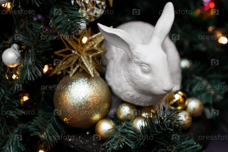Красивые праздничные украшения на елке в золотистых тонах и белый кролик в шапке. Красивый рождественский фон. Новогодняя открытка 2024