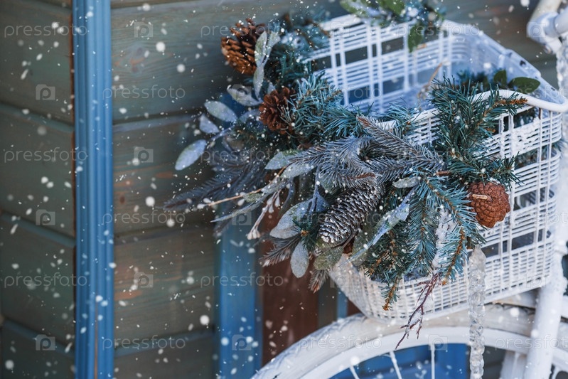 Красивые праздничные украшения. Небольшой домик и ретро-велосипед в парке Горького. Красивый рождественский фон. Концепция украшений и декора к новому году. Новогодняя открытка 2024