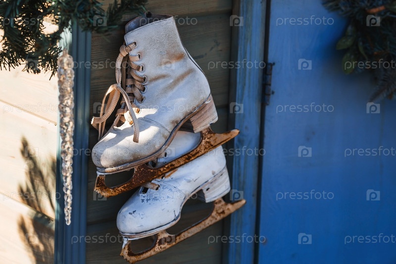 Красивые праздничные украшения. Ржавые коньки для фигурного катания. Красивый рождественский фон. Концепция украшений и декора к новому году. Новогодняя открытка 2024