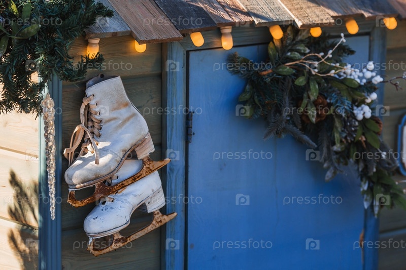 Красивые праздничные украшения. Ржавые коньки для фигурного катания. Красивый рождественский фон. Концепция украшений и декора к новому году. Новогодняя открытка 2024