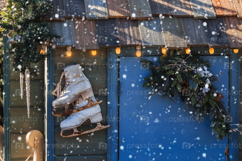 Красивые праздничные украшения. Ржавые коньки для фигурного катания. Красивый рождественский фон. Концепция украшений и декора к новому году. Новогодняя открытка 2024