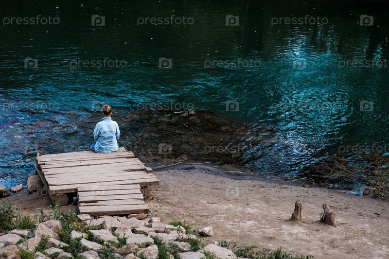 Девушка сидит на берегу голубого озера. Красивый естественный фон. Голубое озеро в Казани. Россия, Республика Татарстан, г. Казань, сентябрь 2023 г