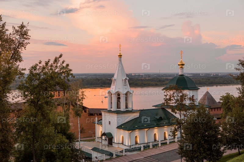 Церковь Симеона Столпника и Белая башня на закате. Вид на храм со смотровой площадки Нижегородского кремля. Россия, Нижний Новгород, август 2023 г