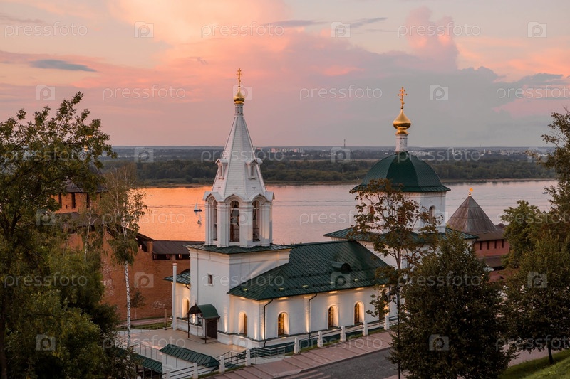 Церковь Симеона Столпника и Белая башня на закате. Вид на храм со смотровой площадки Нижегородского кремля. Россия, Нижний Новгород, август 2023 г