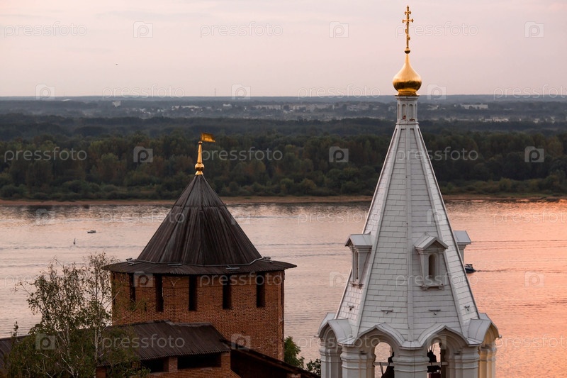 Церковь Симеона Столпника и Белая башня на закате. Вид на храм со смотровой площадки Нижегородского кремля. Россия, Нижний Новгород, август 2023 г