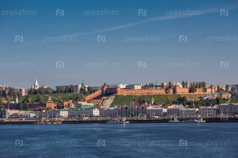 Прекрасный вид на Нижний Новгород с реки Волги в солнечный летний день. Россия, Нижний Новгород, август 2023 г
