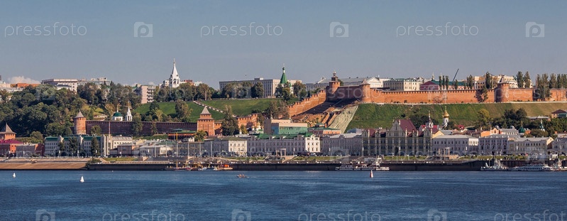 Прекрасный вид на Нижний Новгород с реки Волги в солнечный летний день. Россия, Нижний Новгород, август 2023 г