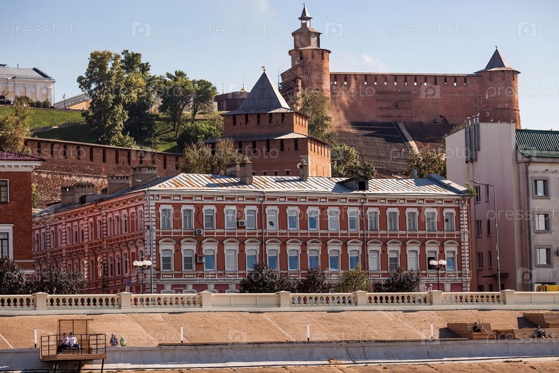 Прекрасный вид на Нижний Новгород с реки Волги в солнечный летний день. Россия, Нижний Новгород, август 2023 г