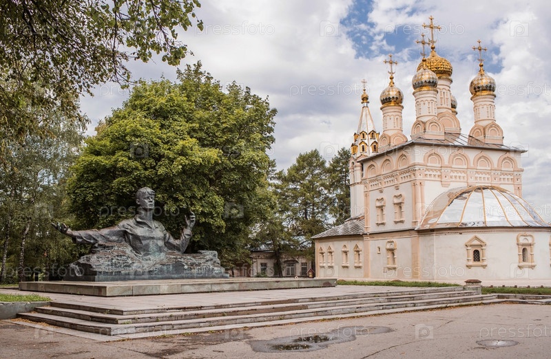 Россия, город Рязань, август 2023 года. Памятник поэту Сергею Есенину на фоне церкви Спаса-на-Яре в Рязани