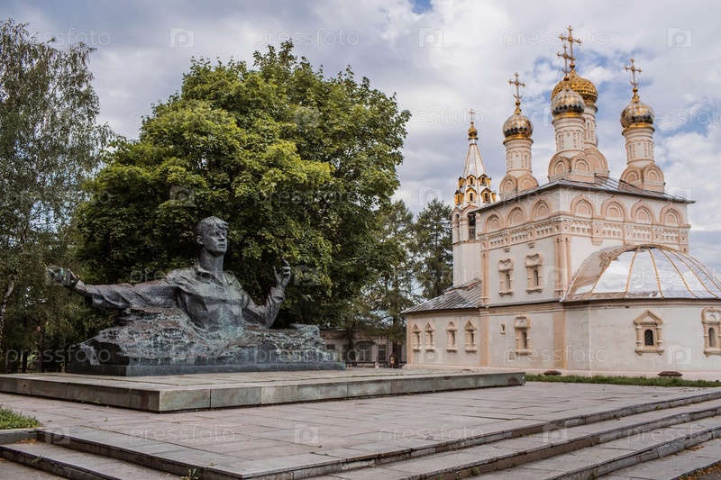 Россия, город Рязань, август 2023 года. Памятник поэту Сергею Есенину на фоне церкви Спаса-на-Яре в Рязани