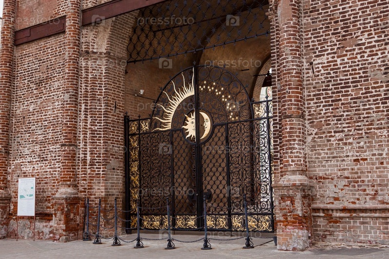 Ажурные ворота из кованого металла с золотыми символами падающей башни Сююмбике. Фрагмент ворот крупным планом. Россия, Республика Татарстан, г. Казань, сентябрь 2023 г