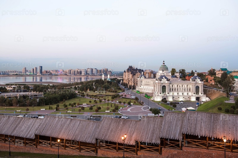 Красивая панорама со смотровой площадки Дворца земледельцев и храмов Казани теплым летним вечером. Россия, Республика Татарстан, г. Казань, сентябрь 2023 г