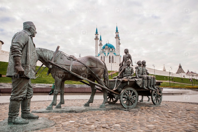 Памятник Асгату Галимзянову, известному меценату Татарстана на фоне Казанского Кремля и мечети Кул Шариф. Россия, Республика Татарстан, г. Казань, сентябрь 2023 г
