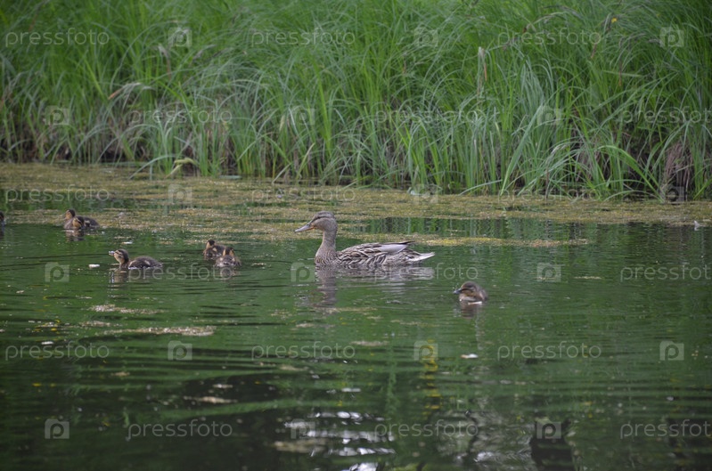 Утка с маленькими утятами плавает в пруду
